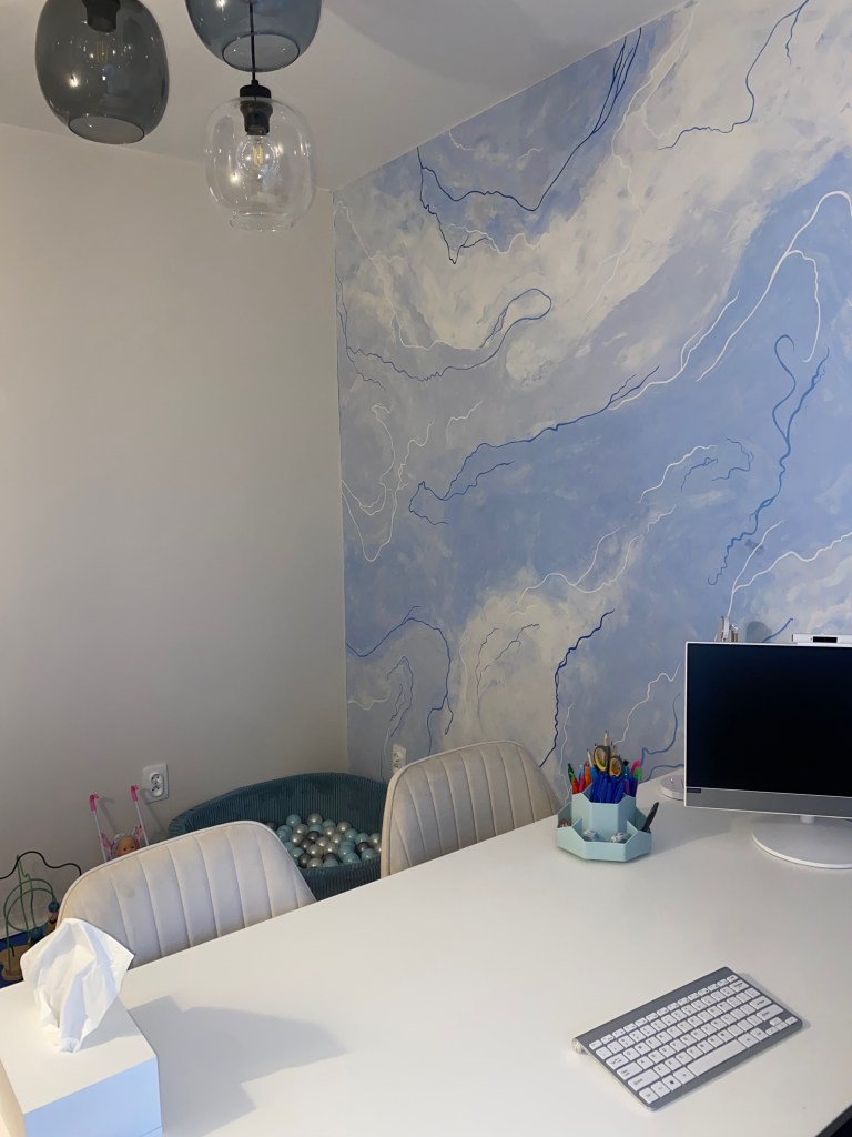 Poczekalnia to jasna, spokojna przestrzeń, w której można na chwilę zatrzymać się przed wizytą. Zależało mi, aby było to miejsce neutralne, bez nadmiaru bodźców – sprzyjające wyciszeniu i poczuciu komfortu.